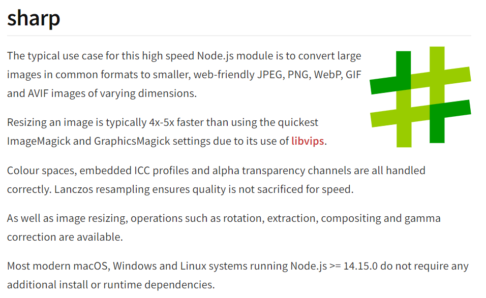 - 하지만 개발환경이 아닌 프로덕션 환경에서는 이미지 로더로 Sharp를 설치하기를 강력히 권장하고 있다.