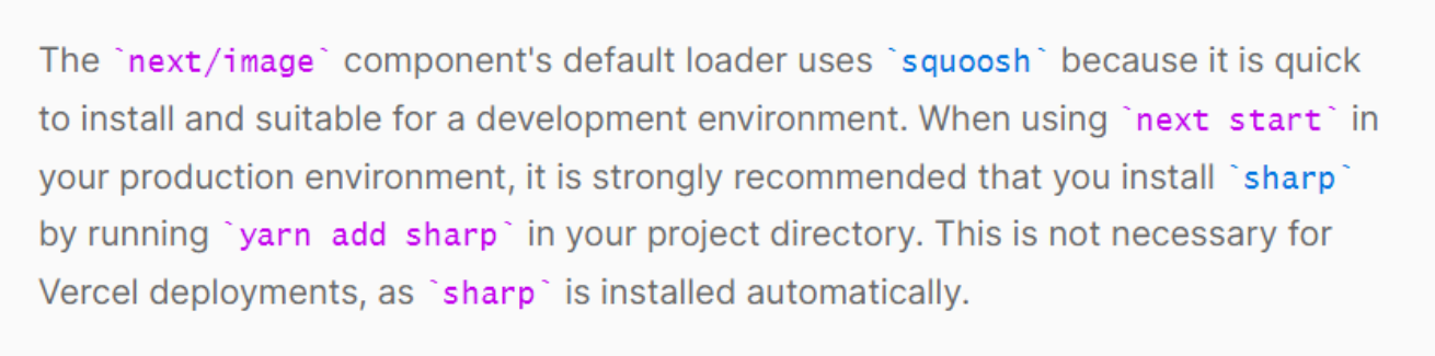 - 공식 문서에 따르면 next/image는 squoosh를 기본 이미지 로더로 사용 중이다. 설치가 빠르고 개발환경에서 안정적이기 때문이다.