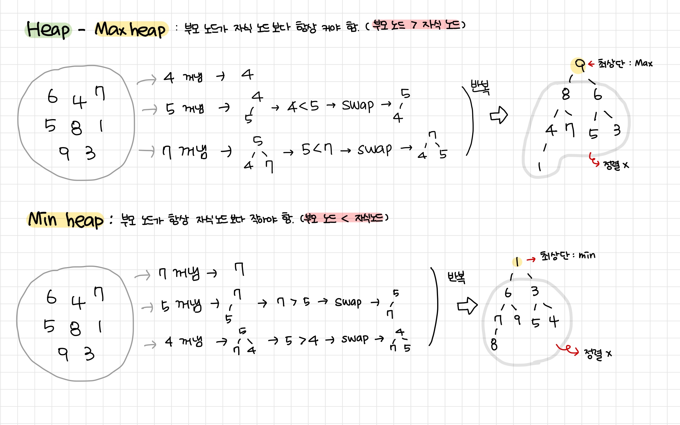 Minheap이면 → 부모 노드보다 자식 노드가 작으면 swap
