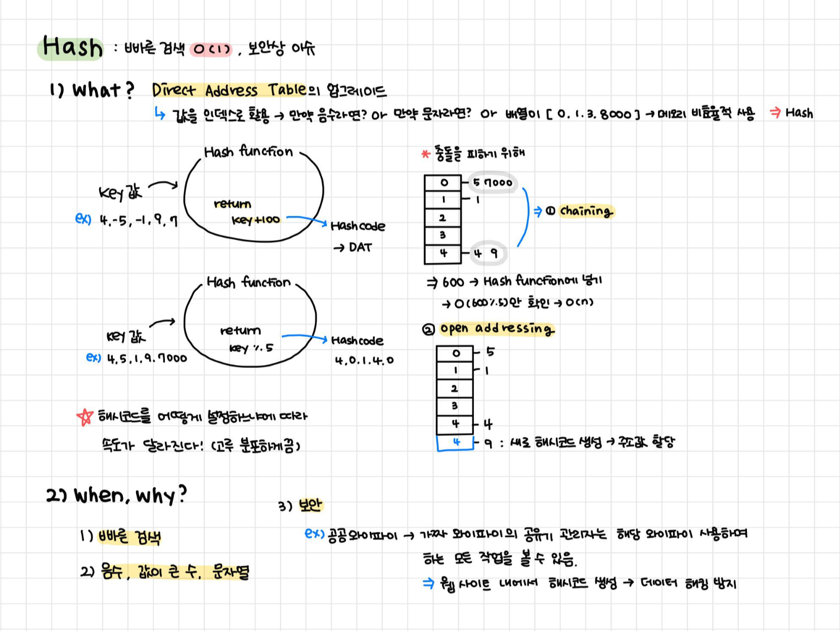 DAT의 문제점(음수, 문자 등 인덱스로 활용하기 불가능하거나 메모리 손해인 경우)를 보완할 수 있는 해시 알고리즘